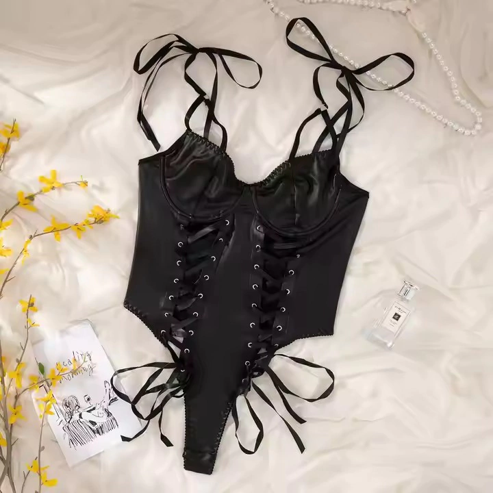 Diseño tipo corset con cordones cruzados que marcan curvas, elevan el busto y activan la imaginación.